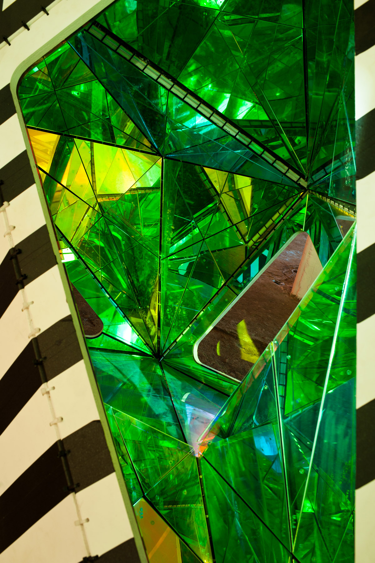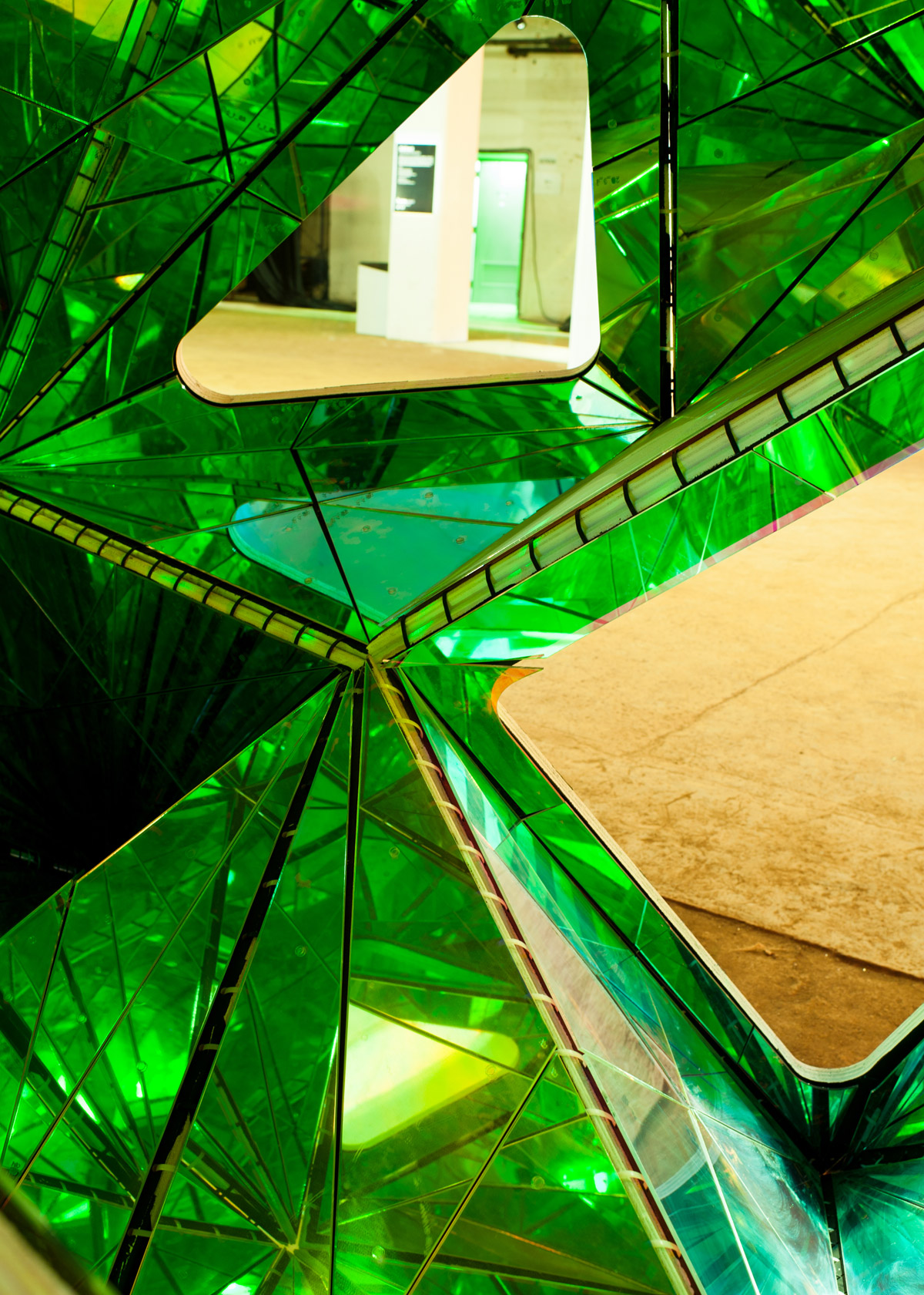 Within, the installation behaves like an irregular kaleidoscope. Reflections fracture the surrounding environment into shifting composites that never fully resolve, blurring distinctions between inside and outside, object and context.